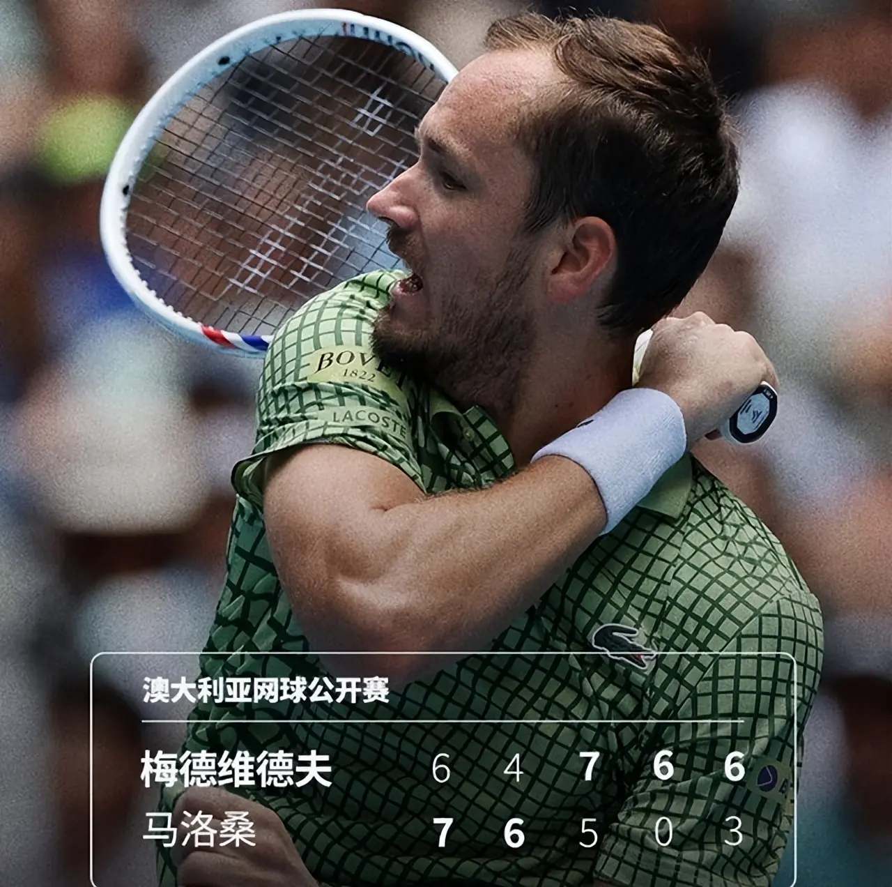 梅德维德夫真的做到了!把握住第三盘的盘末机会完成关键破发以局分7-5扳回一城,随后又在第四盘火力全开三破三保连下六局以局分6-0送蛋,决胜盘凭借多一次破发的优势以局分6-3再胜,最终以大比分3-2逆转淘汰马洛桑晋级澳网男单16强。