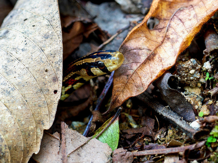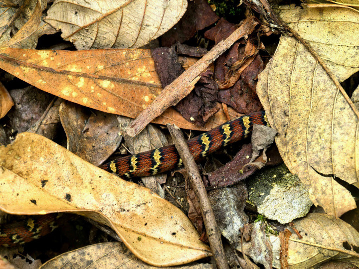 方花蛇(Archelaphebella)隶属游蛇科,是国内极为罕见的无毒蛇类,因黑、红褐与黄色相间的环状斑纹被誉为“最美国蛇”。它主要栖息在海拔1150米以上的潮湿阔叶林区,以鼠类、蜥蜴、蛙类等为食。自1974年首次发现以来,全国记录不足20例,对其繁殖、习性等研究仍十分有限。目前,方花蛇被列入《中国生物多样性红色名录》易危(VU)物种。
